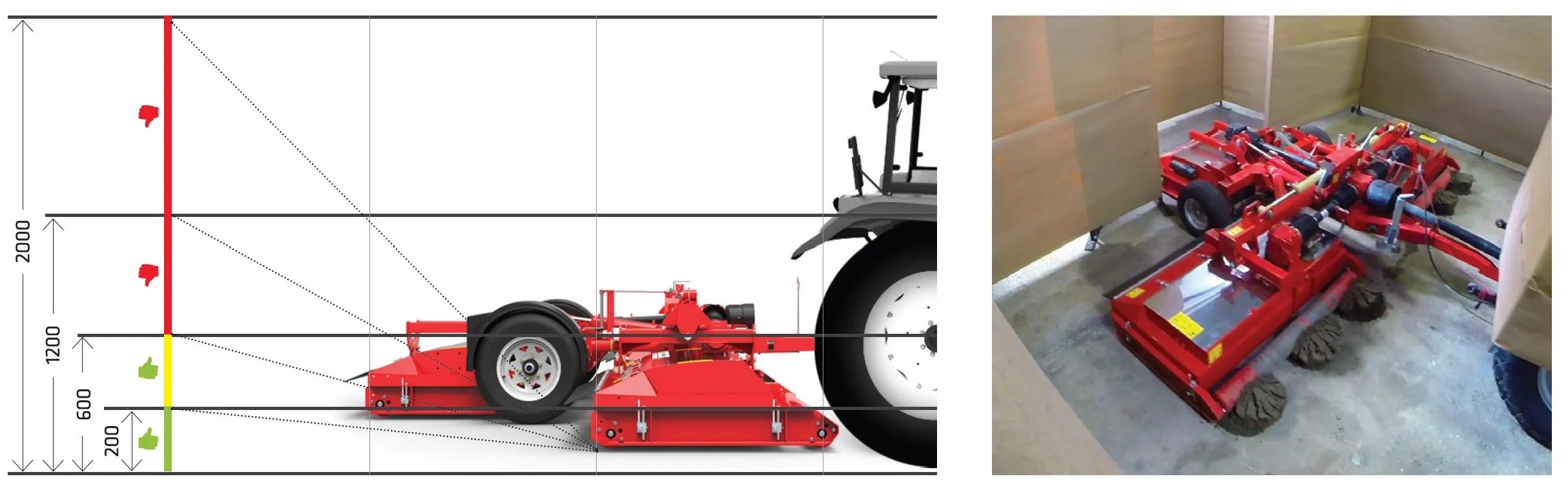 The thrown object test looks at how and where objects are dispersed. During this test, the machine is surrounded by specified targets and will run over sand and stones. To pass the test, no object can be thrown to the side or in the operator area, and only low impacts in the discharge area are acceptable.